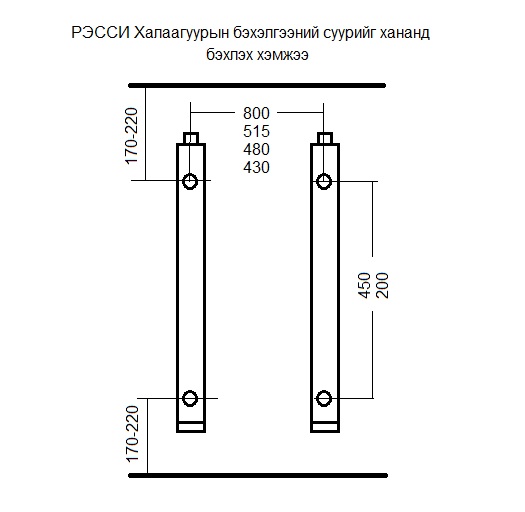 Бэхэлгээний суурь төмрийг халаагуур байрлуулах хананд дулаан ойлгогч дэлгэцийн цаад талд зургийн дагуу бэхэлж байрлуулна.